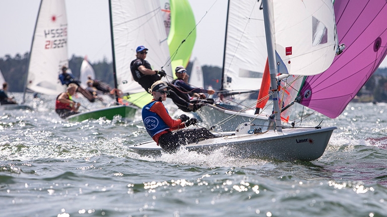 Bilden är från Lilla Gotland Runt på Baggensfjärden av Henrik Trygg. I massan av båtar ser vi totalvinnarna Melker Brenton och Albert Norlen i sin 29er jagandes Sofia Levin Håkansson i förgrunden.