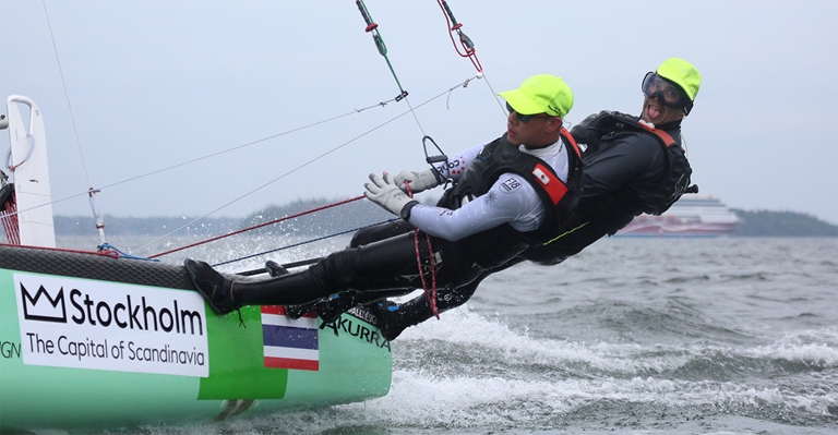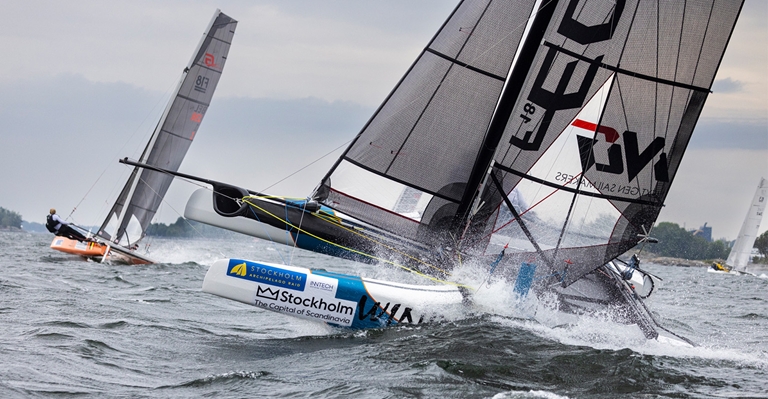 Det blev ytterligare en rykande halvvind över Gälnan in mot Nässlingen. På vägen fick Jakob och Rasmus ett tekniskt problem som ledde till en kappsejsning och trots att de snabbt kom igång igen ledde det till att de släppte Demesmaeker, Gagliani och ytterligare 2 team framför sig. Även australiensarna gjorde ytterligare en habil segling och ligger nu på tredje plats i totalen. På grund av ökande vindar beslöt tävlingsledningen att inte genomföra fler seglingar på lördagen. Det innebär att podiet efter sju genomförda seglingar ser ut som följer: