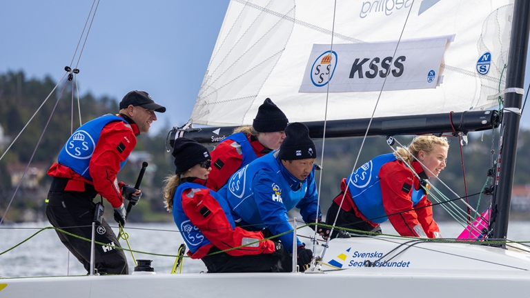 Men det satt långt inne. Åmålsviken kom till den fjärde och sista deltävlingen på KSSS hemmavatten – Baggensfjärden – med fem poängs ledning. Men ett tag såg det ut som om rutinerade Niklas Edler, rorsman hos KSSS, skulle vända matchen och segla hem guldet. Sakta men säkert hämtade KSSS in Åmålsvikens försprång – och ett tag var de till och med förbi.