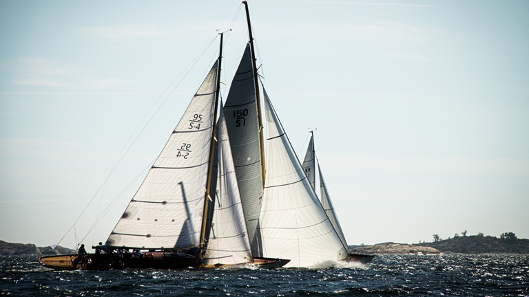 Det är torsdag och som solen skiner som oftast när det är kappsegling i Sandhamn. Den första dagen av den klassiska Sandhamnsregattan by Bluewater har precis avslutats. Regattan jubilerar med imponerande 125 år. Årets regatta seglas i tre klasser av klassiska träbåtar som är indelade efter SRS-tal, totalt är det 28 startande båtar.